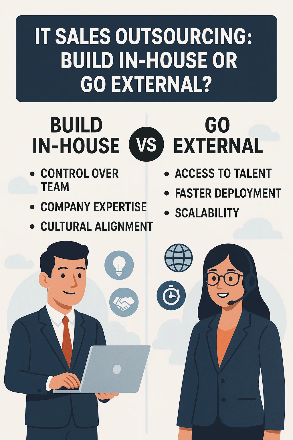 One of the most important decisions that IT and SaaS companies must make as they expand is whether to outsource their sales efforts or create a full-time in-house sales team. Many tech companies, especially startups and small teams, now use outsourcing sales as a common strategy to speed up the process without having to pay for and commit to hiring people internally. But, when you think about it, how can one determine when outsourcing makes sense and when maintaining sales in-house is preferable?